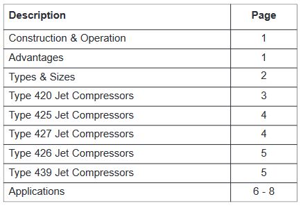 Types and sizes of S&K Jet Compressors are listed in the following pages. Types include the following: fixed-nozzle type compressors; compressors with manually-controlled spindle; compressors with automatically-controlled spindle.