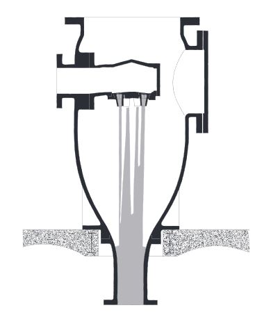 Condensing water is delivered into the nozzle case and ejected through the nozzles. These are carefully designed to handle a specified amount of water at stated pressure and guaranteed vacuum. The water jets are directed into the tail-piece at the lower end of the body, where they unite to form a single jet. Vapors entering the condenser come into direct contact with the converging water and are condensed. Non-condensables are also entrained and discharged by the water jet action. Terminal difference obtainable with this type of condenser is 11 to 13°F.